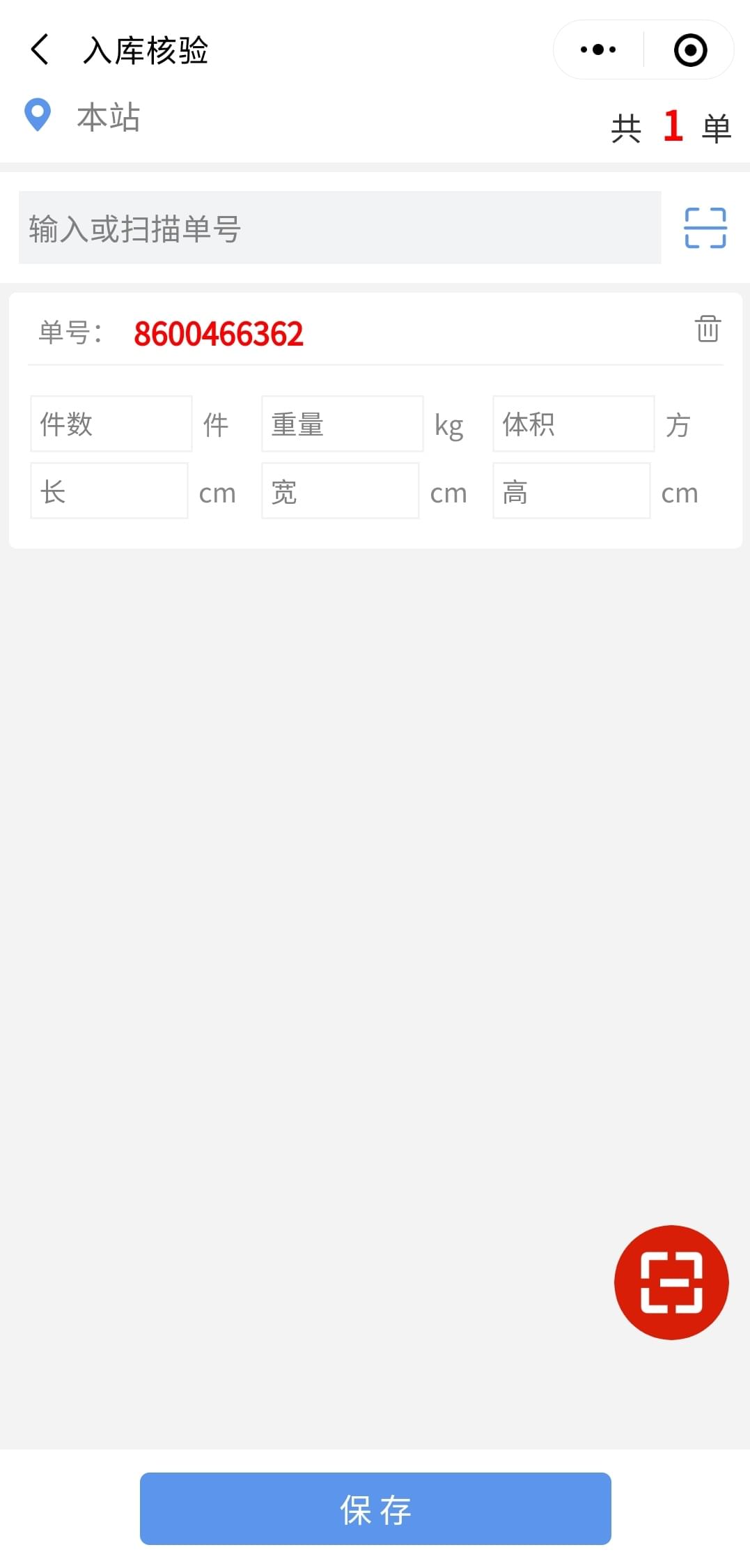 点击红色图标开始扫码,或者在上部输入单号,则在下方出现此单信息填写框。输入长、宽、高等信息自动计算体积,填写好之后